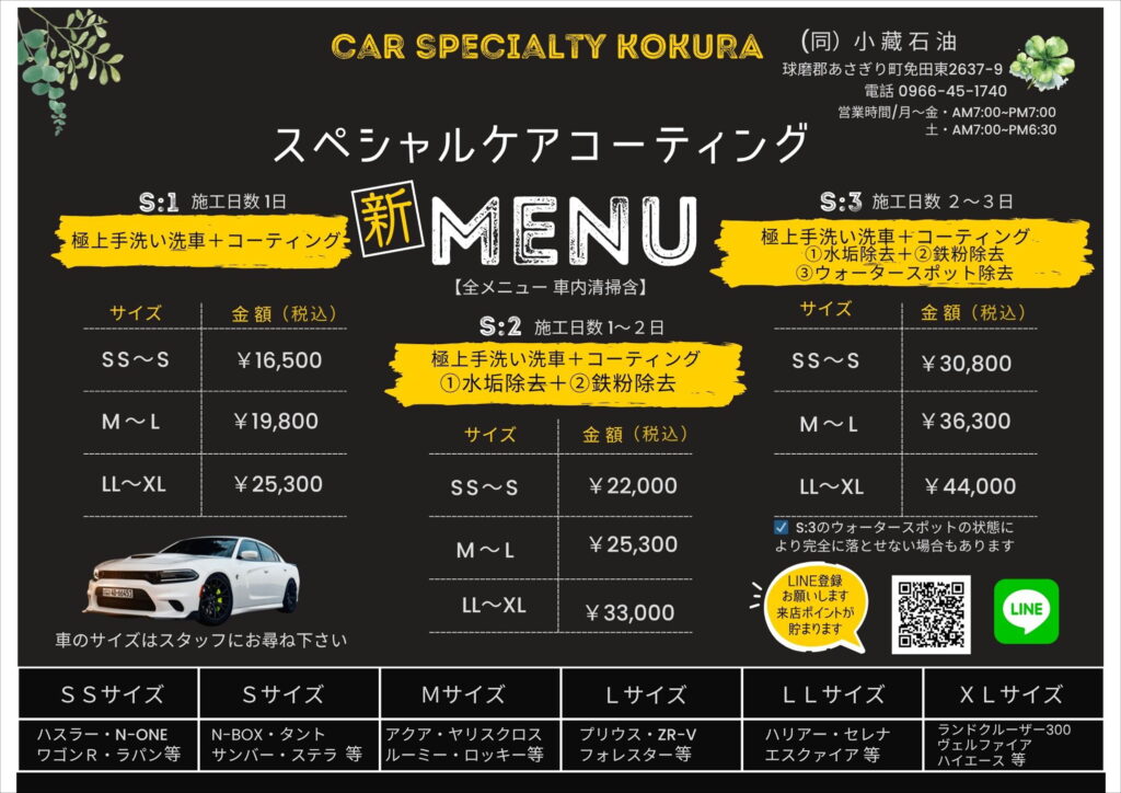 今までのガラスコーティング施工は、施工時間と料金も高いイメージがありましたが、今回の新メニュー、「スペシャルケアコーティング」は、洗車にこだわっている当店は、細かい部分の汚れを落とし、徹底した極上の洗車をしていきます。