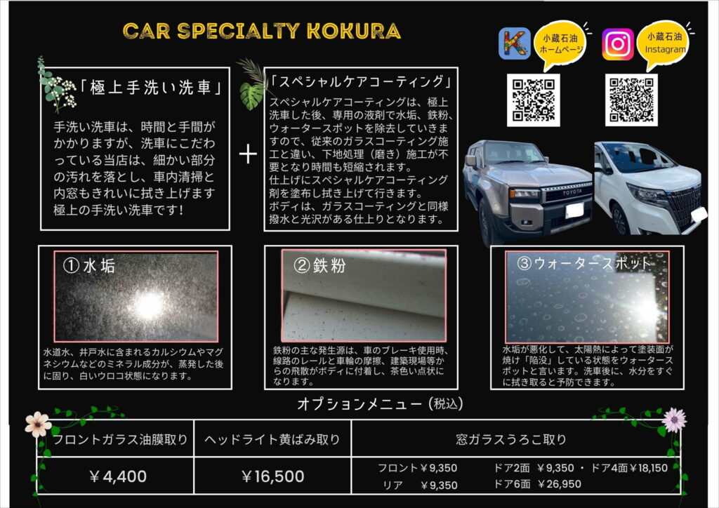 オプションメニューも、フロントガラス油膜取りや、ヘッドライト黄ばみ取り、窓ガラスうろこ取りをプラスして、新車のような車にしていきませんか!